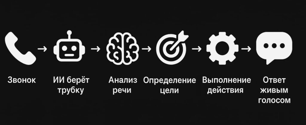📞 Звонок → 🤖 ИИ берёт трубку → 🧠 Анализ речи → 🎯 Определение цели → ⚙️ Выполнение действия → 💬 Ответ живым голосом